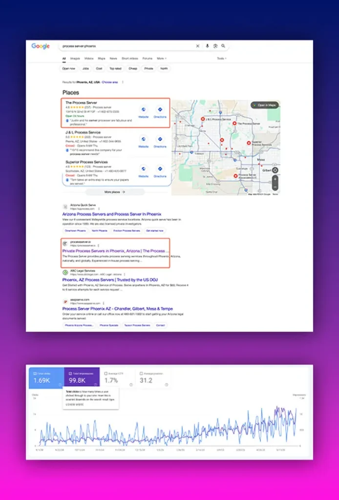 The business had a brand-new website but wasn’t ranking for any relevant keywords. Despite offering quality service in Phoenix, they had minimal online visibility, no Google Business Profile optimization, and zero local SEO presence. Potential clients couldn’t find them through Google Search or Maps, which meant lost leads and limited business growth.
